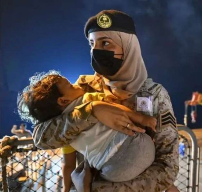 شاهد: مجندة سعودية ”تخطف القلوب” بما فعلته مع طفل عائد من السودان
