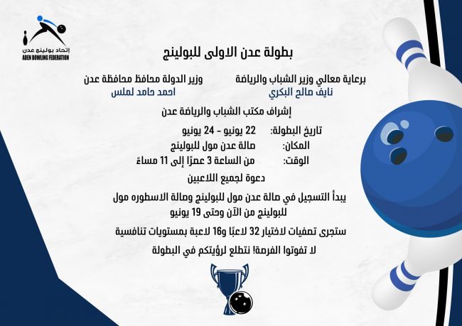 صرح رئيس اتحاد عدن للبولينج يونس أحمد صالح، أن 22 يونيو الجاري إنطلاق بطولة عدن الأولى للبولينج التي ستقام منافساتها في صالة عدن مول للبولينج بمديرية صيرة، برعاية وزير الشباب و...